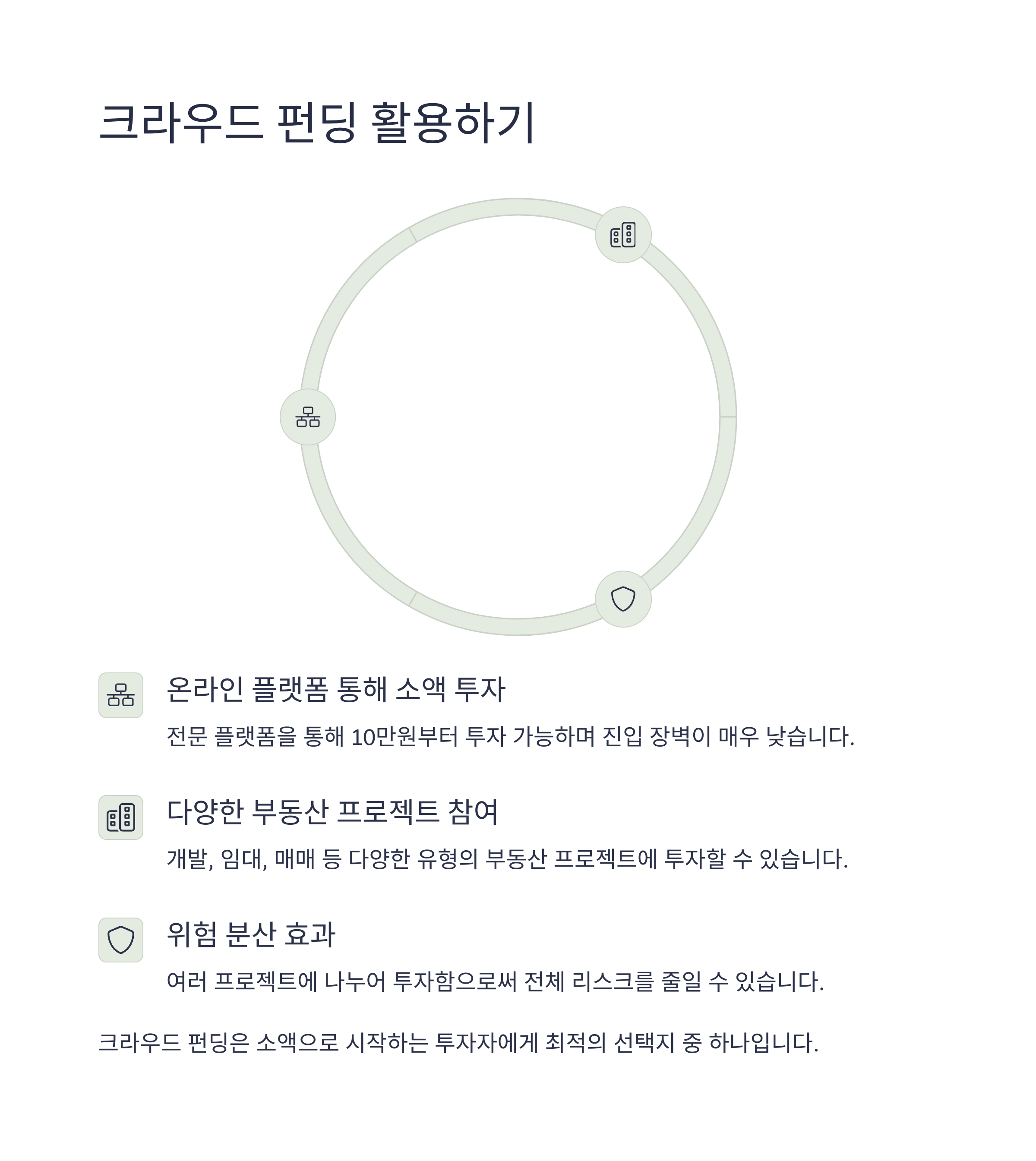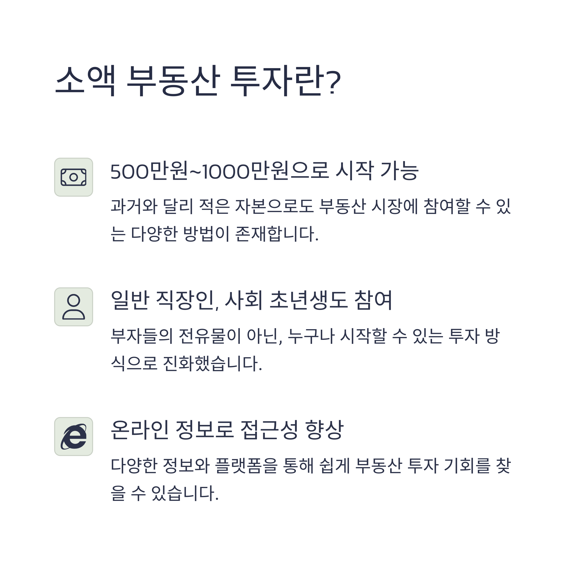 부동산 투자는 다양한 진입 방식이 있으며, 꼭 고가의 자산이 아니더라도 접근할 수 있는 소액 투자 수단이 존재합니다.