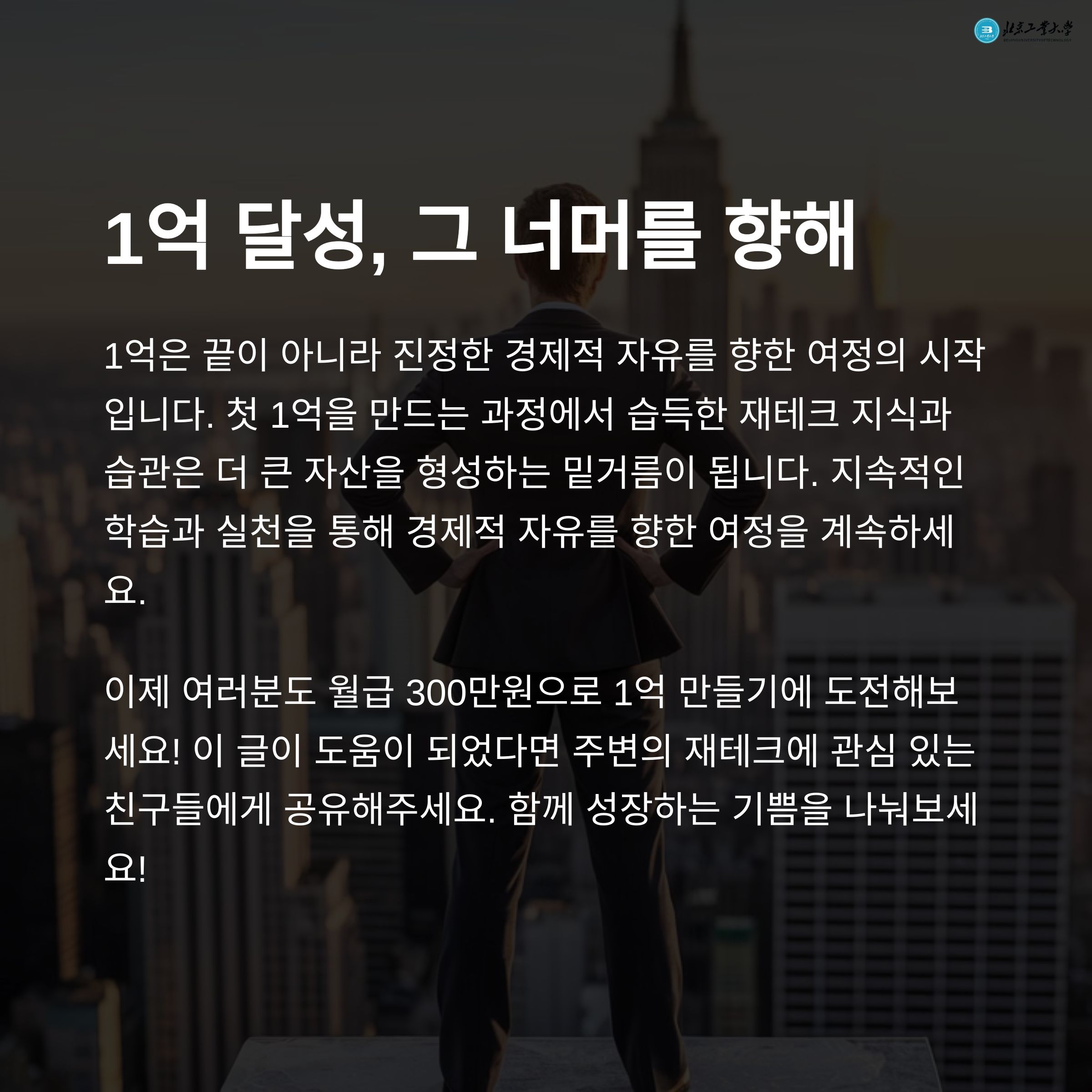 오늘도 함께해 주셔서 감사합니다. 월급 300만원으로 1억을 만든다는 목표는 현실적일 수 있습니다. 단순한 꿈이 아닌, 매일의 선택과 습관을 통해 가까워질 수 있는 실현 가능한 목표입니다. 작은 실천들이 모여 큰 결과를 만들고, 그 과정이 결국 삶을 바꾸는 여정이 될 거예요. 오늘부터라도 한 걸음씩 시작해보세요. 꾸준함은 결국 배신하지 않습니다. 여러분의 경제적 자유를 진심으로 응원합니다.