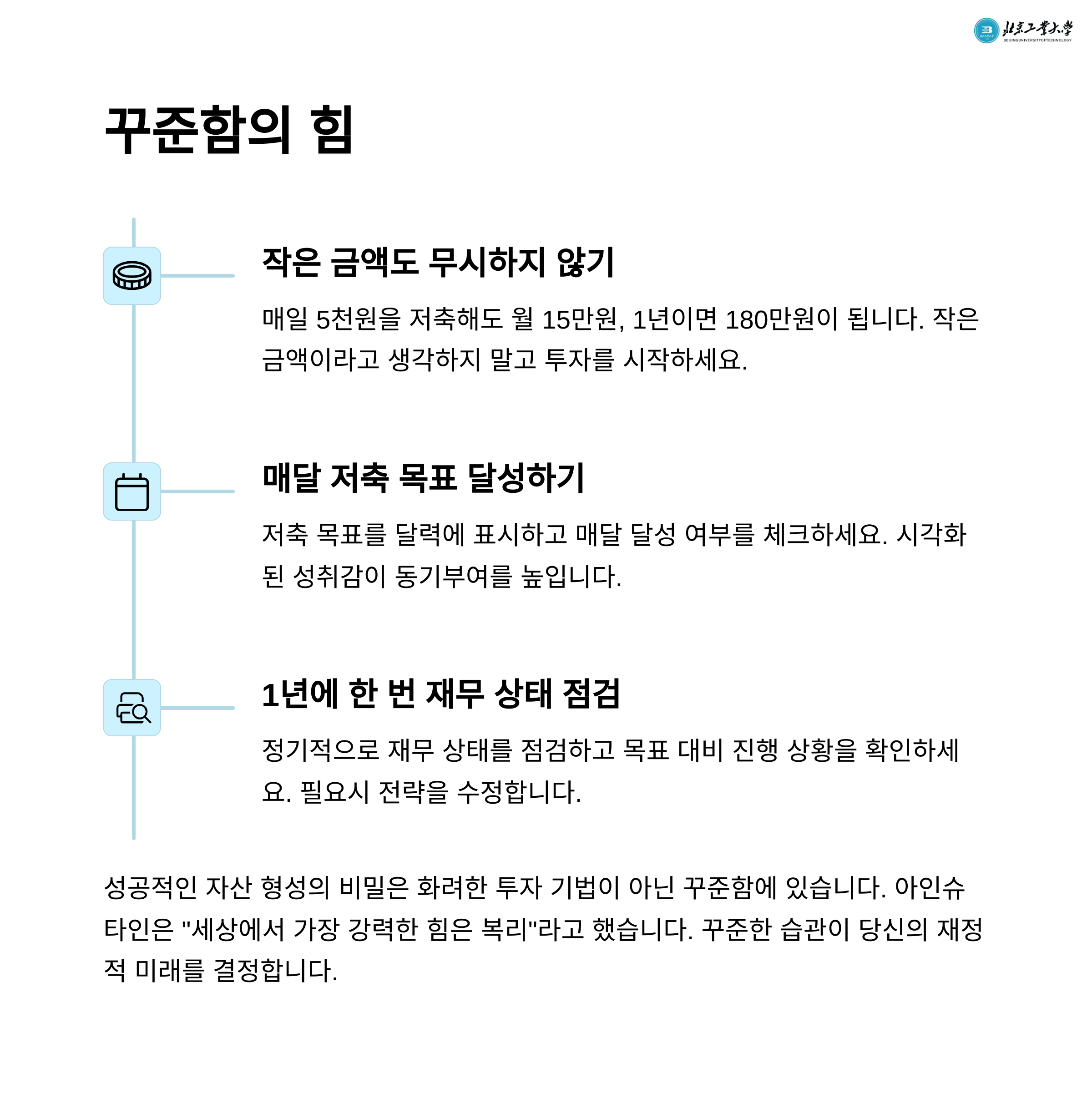 소비 절제, 자동이체 등 일상 속 실천이 중요합니다.