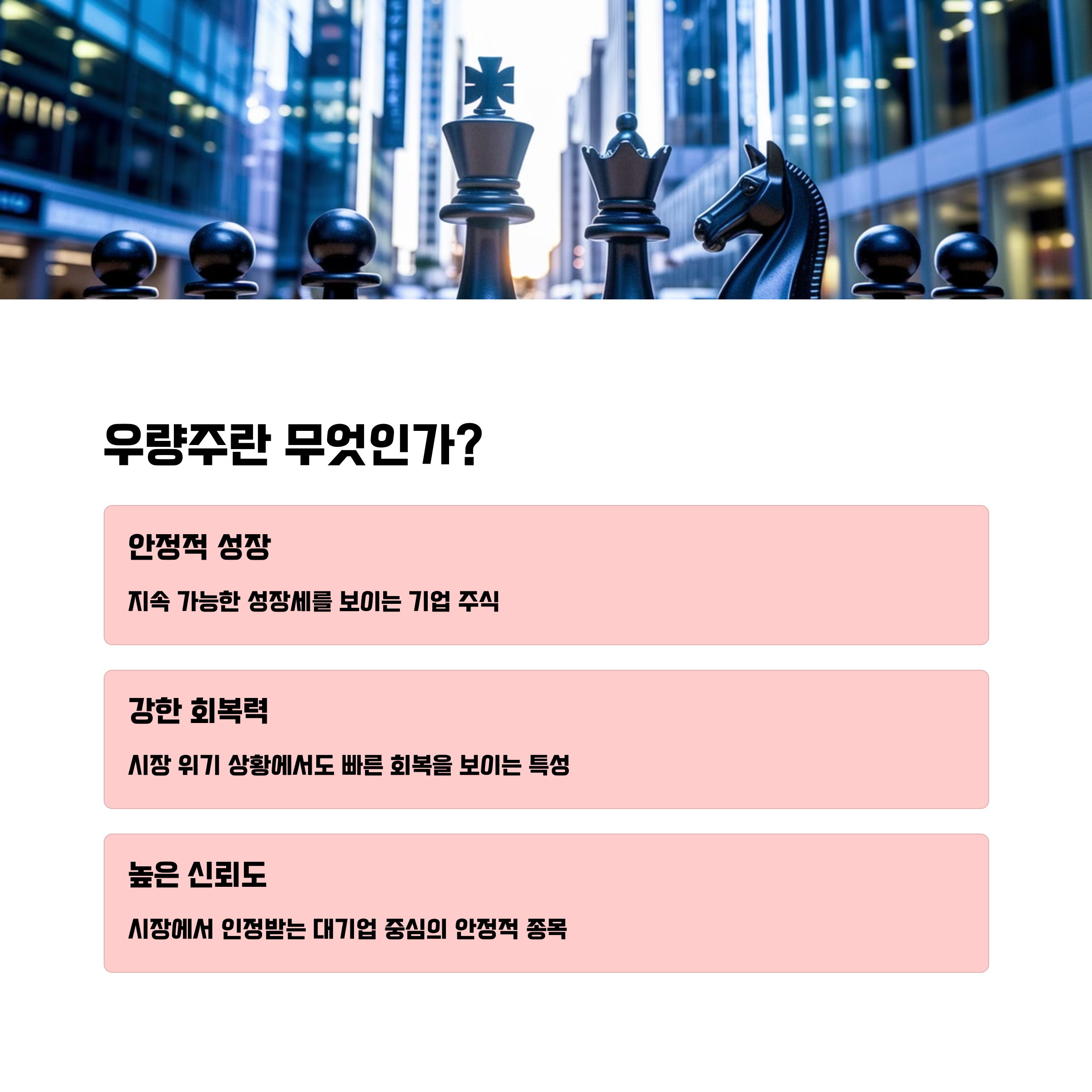 우량주란 안정적이고 지속 가능한 성장을 이루는 기업의 주식입니다. 이러한 기업들은 꾸준한 수익을 창출하며, 위기 상황에서도 상대적으로 강한 저항력을 보입니다. 대표적인 우량주로는 대기업들이 많으며, 시장에서의 신뢰도와 안정성이 높습니다.